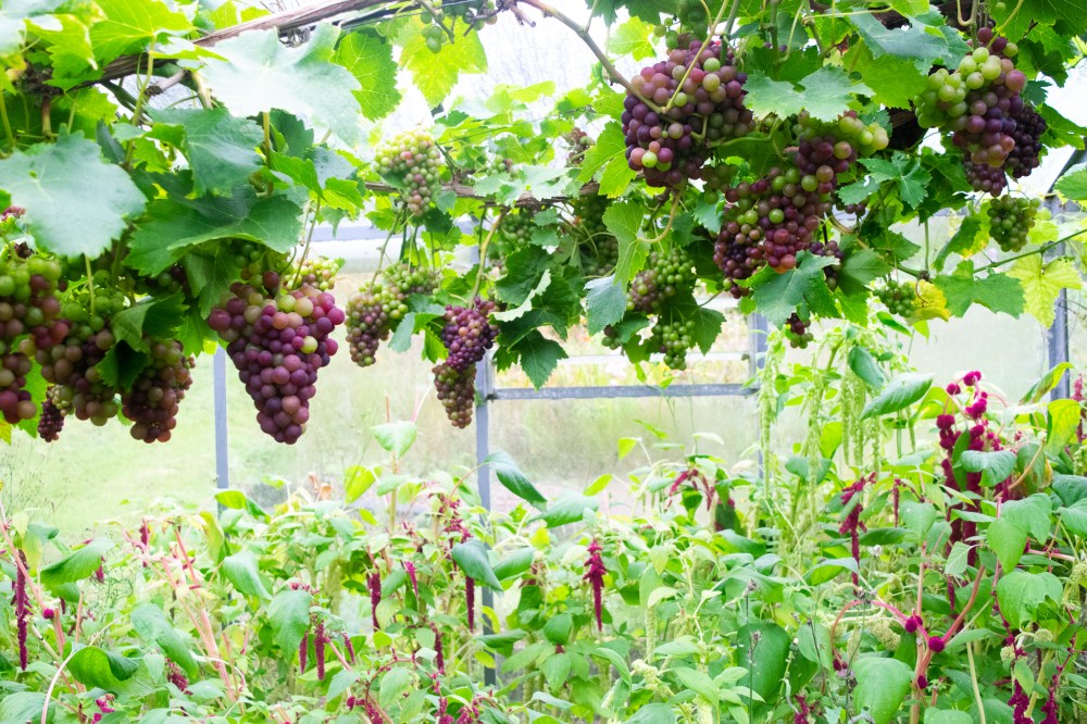 Hanna talks us through her field of colour, her loves and her challenges. She shows Clodagh her favourite flower – the cup and saucer climber which is going wild in her greenhouse. One of her greenhouses is dedicated to burgundy it seems – grapes cascading from above and amaranthus rising from below. What a sight.