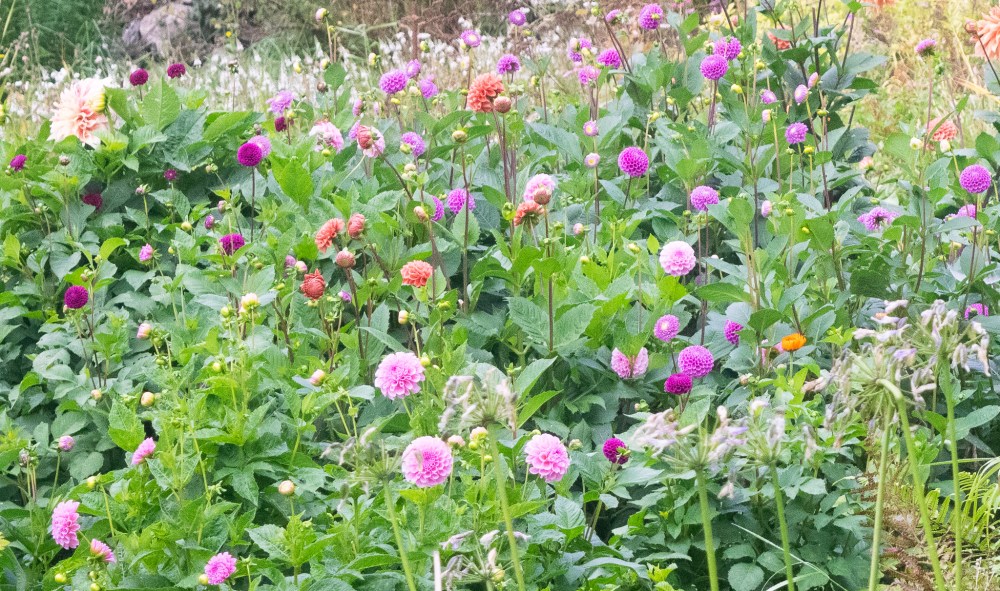 We hurry up the lane to see a stunning vision of colour. Pinks, oranges, burgundies , whites. There’s grasses swaying and dahlia blooms bobbing in the breeze. Clodagh runs to the field of colour like a kid in a toy shop, we follow behind.