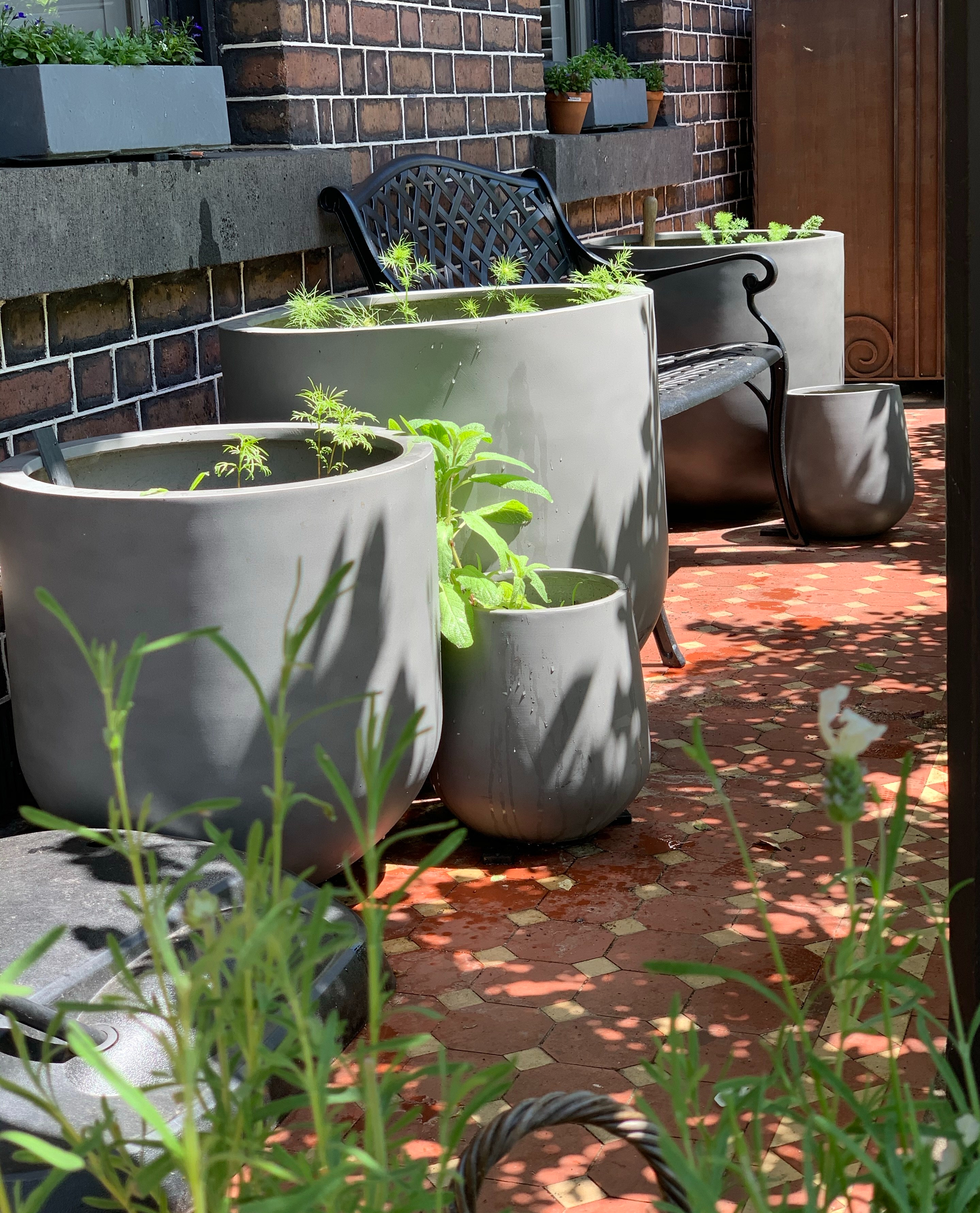 Seedlings have just been transplanted to the planter and children’s toy baskets out the back.