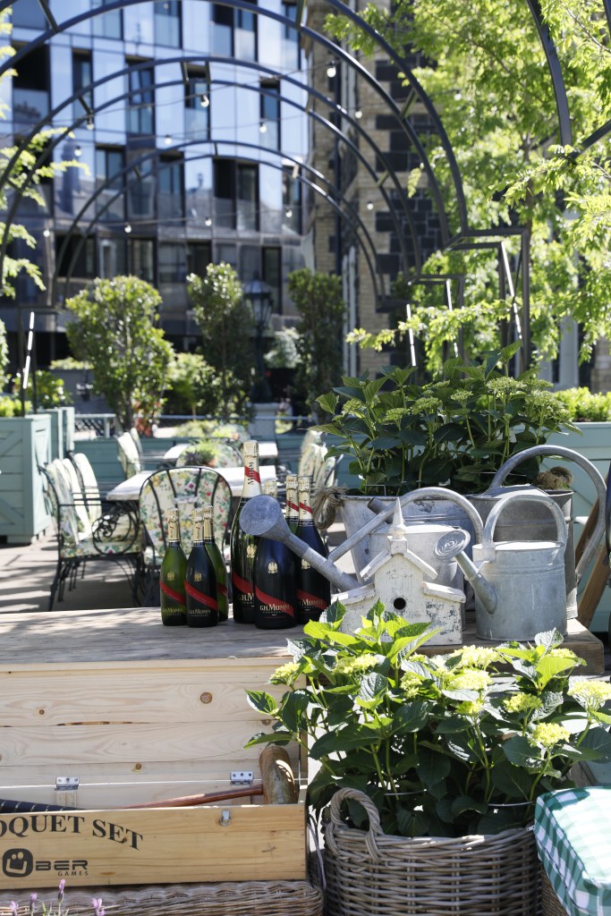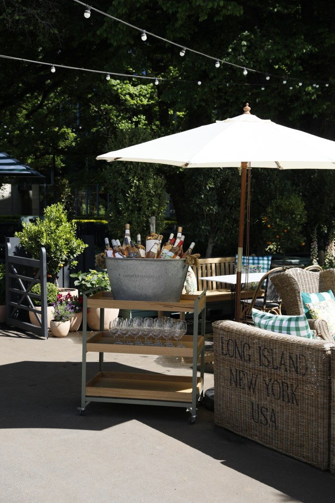 The sprawling gardens have been enhanced with topiary and burgeoning florals. Foxgloves and hydrangeas spill out of basketry, wooden troughs and terracotta while provincial garden objects are elegantly styled in the Kitchen garden, the glasshouse conservatory and main garden. This and the oversized cane furniture provides a luxurious garden party vibe while secluding and separating diners amongst the four micro-hotspots.